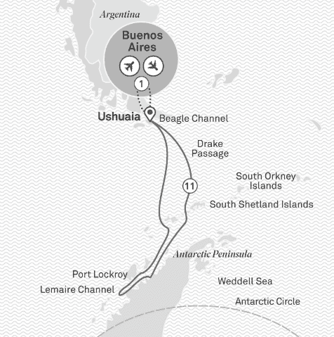 Primeiramente, depois de chegar de Buenos Aires a Ushuaia, na Argentina, os turistas são recebidos na embarcação para dar início à expedição. Uma das primeiras atrações é o Canal de Beagle, estreito que separa as ilhas do arquipélago da Terra do Fogo.