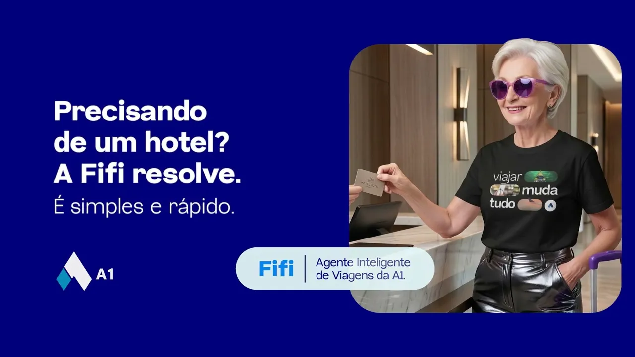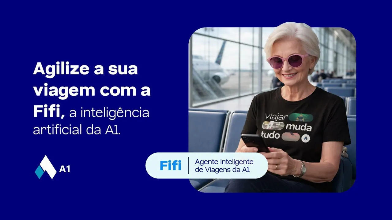A Fifi é a inteligência artificial da A1 que resolve tudo pelo WhatsApp ou Teams. Você pede e ela emite suas passagens e hospedagens, de acordo com a política de viagens da sua empresa.